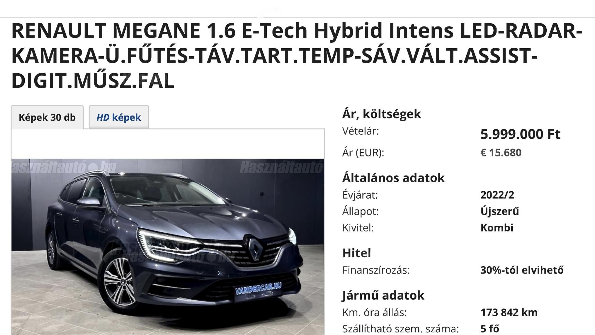 -200.000.-FT / ÚJ ÁRAZÁS - KÉSZLETFRISSÍTÉS KERETÉBEN! GYORS DÖNTÉS ESETÉN, KÉSZPÉNZES FIZETÉSSEL EGYEDI MEGÁLLAPODÁS LEHETŐSÉGE: AJÁNDÉK KERÉKGARNITÚRA GUMIVAL, VAGY KORREKT ALKU MEGBESZÉLHETŐ! RENAULT MEGANE E-TECH PLUG-IN HYBRIDBEN EGY 1.6 LITERES BENZINES ERŐFORRÁS ÉS EGY VILLANYMOTOR DOLGOZIK ÖSSZEHANGOLTAN, 160 LÓERŐS TELJESÍTMÉNNYEL, AMELY DINAMIKUS MOZGÁST ÉS KIEMELKEDŐ HATÉKONYSÁGOT BIZTOSÍT. AZ AUTOMATA VÁLTÓ FINOM, ZÖKKENŐMENTES MŰKÖDÉSÉVEL KIVÁLÓAN ILLESZKEDIK A MODERN HIBRID TECHNOLÓGIÁHOZ, EZÁLTAL A VEZETÉSI ÉLMÉNY KIFINOMULT ÉS KÉNYELMES MARAD MINDEN HELYZETBEN. A KÜLSŐ FORMAVILÁGOT AZ ELEGÁNS ARÁNYOK, A LETISZTULT VONALVEZETÉS ÉS A KARAKTERES LED PURE FÉNYSZÓRÓK TESZIK FELISMERHETŐVÉ, MELYEK EGYARÁNT SUGÁROZNAK STÍLUST ÉS MAGABIZTOSSÁGOT. A BELSŐ TÉR TÁGAS ÉS FUNKCIONÁLIS, RUGALMASAN ALKALMAZHATÓ A MINDENNAPOKBAN, MIKÖZBEN A PLUG-IN HIBRID RENDSZERNEK KÖSZÖNHETŐEN LEHETŐSÉGET KÍNÁL RÖVID UTAK TELJESEN ELEKTROMOS MEGTÉTELÉRE IS. AZ INTENS FELSZERELTSÉGI SZINT OLYAN PRÉMIUM MEGOLDÁSOKAT KÍNÁL, MINT AZ ELSŐ ÉS HÁTSÓ PARKOLÁST SEGÍTŐ RADAROK, A TOLATÓKAMERA, A TÁVOLSÁGTARTÓ TEMPOMAT ÉS A FULL LED FÉNYSZÓRÓK, MELYEK BIZTONSÁGOT ÉS KÉNYELMET NYÚJTANAK. AZ AMBIENT BELSŐ HANGULATVILÁGÍTÁS, A MULTI-SENSE RENDSZER ÉS A NAGYMÉRETŰ ÉRINTŐKÉPERNYŐVEL ELLÁTOTT EASY LINK MULTIMÉDIA KÖZPONT PEDIG A KIFINOMULT TECHNOLÓGIA ÉS AZ ELEGÁNS ATMOSZFÉRA TÖKÉLETES EGYSÉGÉT TEREMTIK MEG AZ UTASTÉRBEN. |